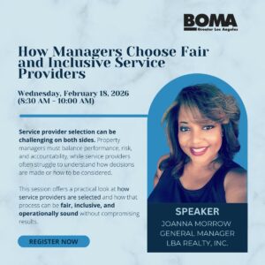 Continue ReadingBOMA/GLA’s Political Action Committee (PAC) is starting the year by interviewing candidates running for the Los Angeles City Council—early in the election cycle, when conversations can still shape priorities. These interviews help ensure decision-makers understand how their policies affect commercial real estate, jobs, and the economic health of Los Angeles.
