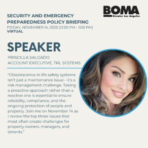 Join BOMA/GLA’s Security and Emergency Preparedness Committee for an insightful policy briefing on Friday, November 14th, featuring Priscilla Salgado, Account Executive at TRL Systems. Priscilla will discuss the importance of proactive planning in fire life safety systems, highlighting how taking action before issues arise is key to risk management and compliance.